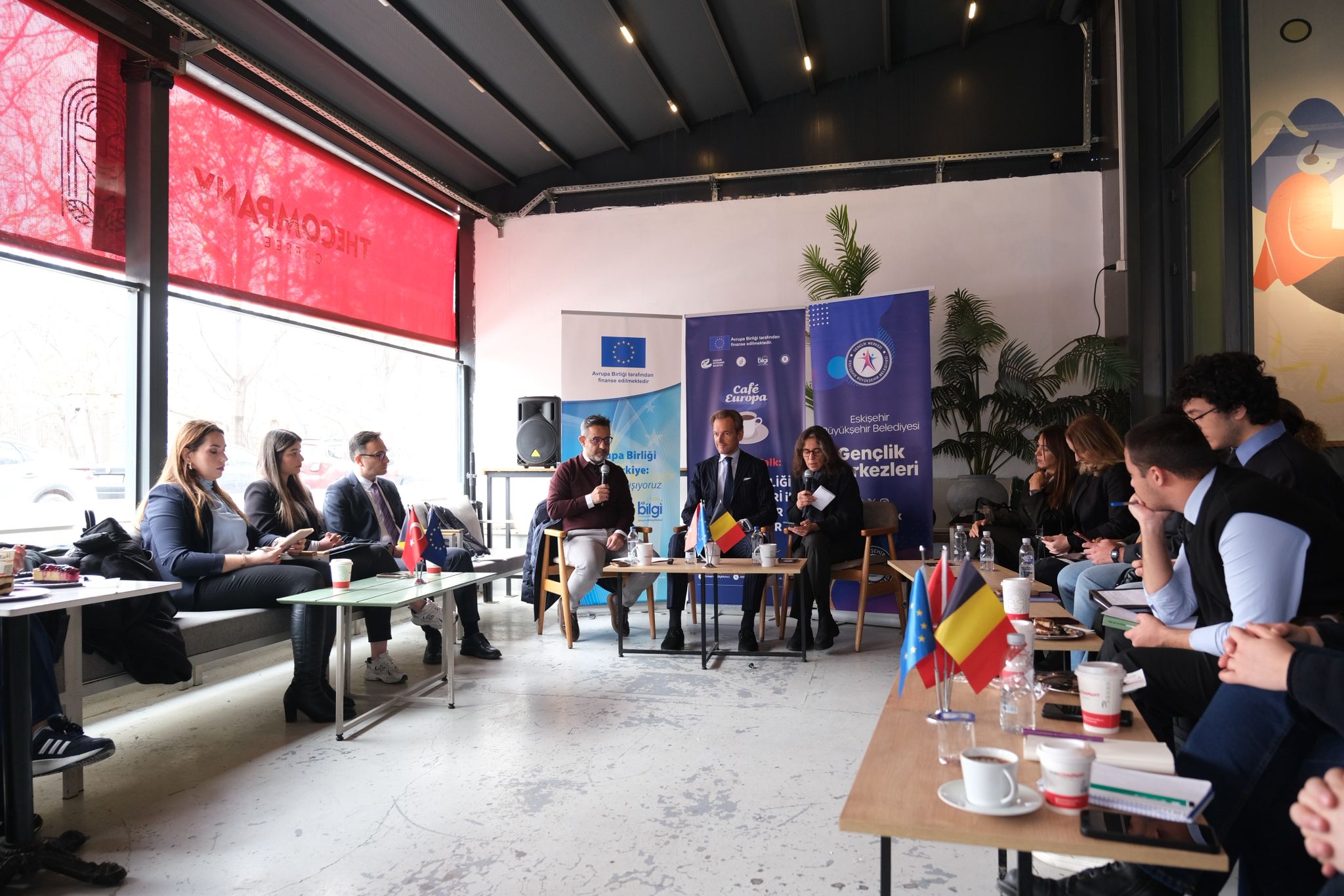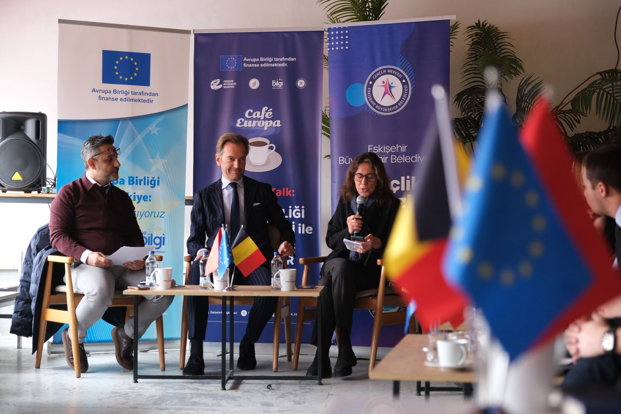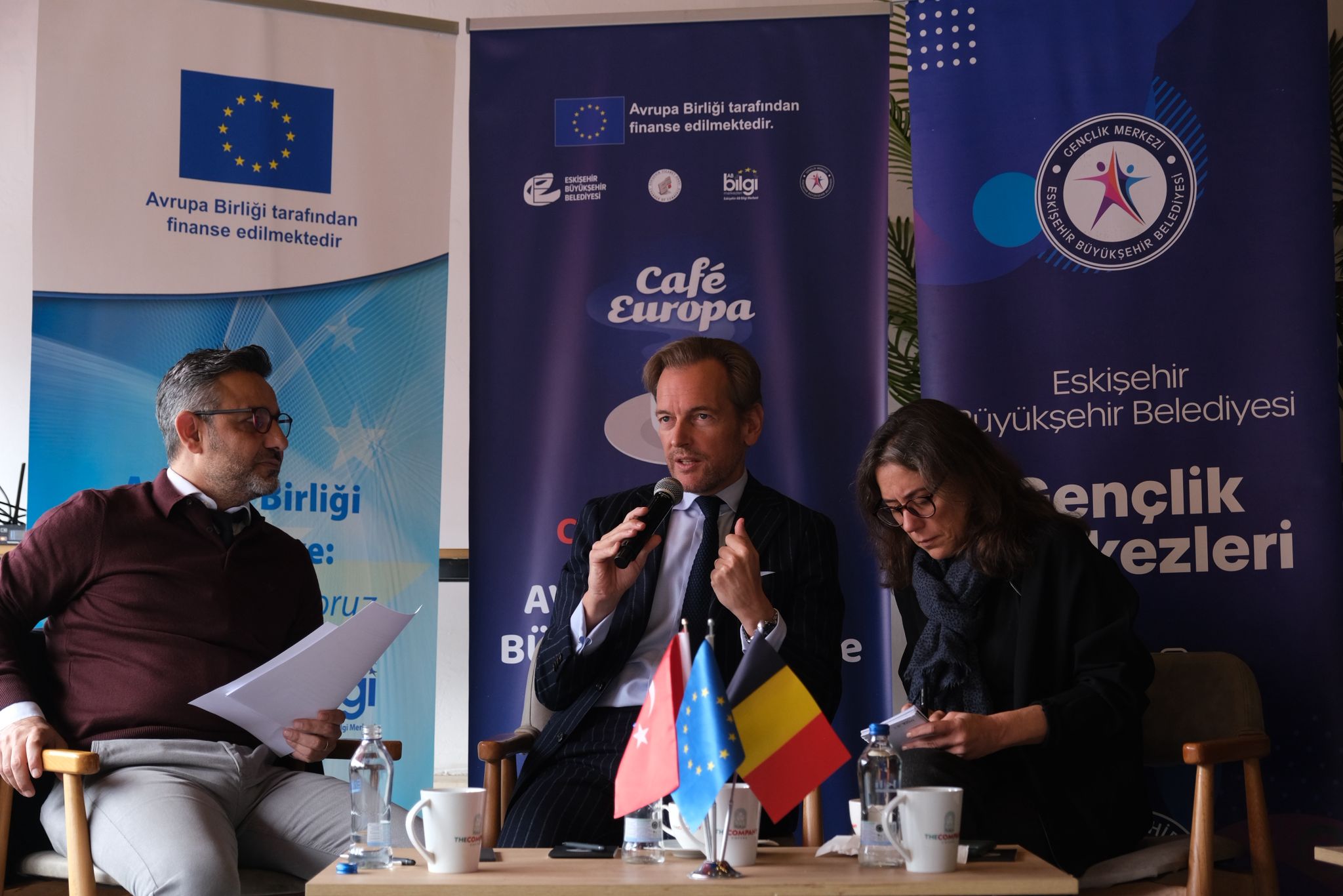 Eskişehir AB Bilgi Merkezi tarafından, Eskişehir Büyükşehir Belediyesi Gençlik Merkezi iş birliğiyle düzenlenen Café Europa – Belçika Buluşması, Belçika ve Avrupa Birliği konularına ilgi duyan öğrenciler, akademisyenler ve ilgili paydaşların katılımıyla gerçekleştirildi. Etkinlik, Türkiye-AB ilişkileri, Belçika’nın AB içindeki rolü ve Avrupa politikalarının güncel gelişmeleri üzerine kapsamlı bir tartışma platformu sundu.