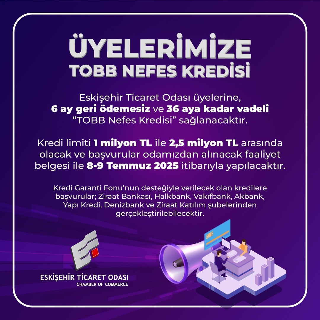 Eskişehir Ticaret Odası üyelerine, 6 ay geri ödemesiz ve 36 aya kadar vadeli “TOBB Nefes Kredisi” sağlanacaktır. Kredi limiti 1 milyon TL ile 2,5 milyon TL arasında olacak ve başvurular odamızdan alınacak faaliyet belgesi ile 8-9 Temmuz 2025 itibarıyla yapılacaktır. Kredi Garanti Fonu’nun desteğiyle verilecek olan kredilere başvurular; Ziraat Bankası, Halkbank, Vakıfbank, Akbank, Yapı Kredi, Denizbank ve Ziraat Katılım şubelerinden gerçekleştirilebilecektir.