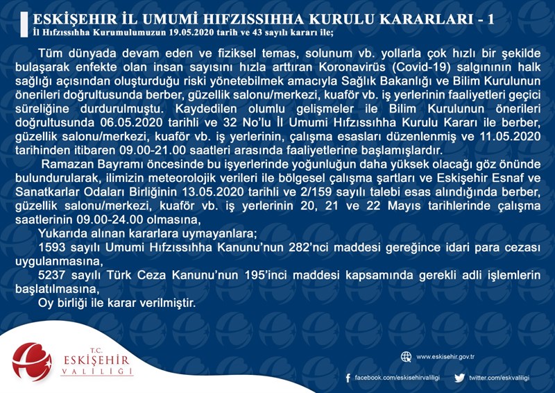 İl Umumi Hıfzıssıhha Kurul Kararı - 19.05.2020 Karar No:43