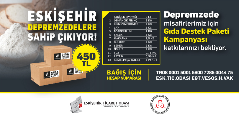 Eskişehir Ticaret Odası tarafından şehirdeki depremzede vatandaşlara destek olmak amacıyla gıda paketi kampanyası başlatıldı. Eskişehir Ticaret Odası (ETO) tarafından depremzedelerin yaralarının sarılması için bir kampanya daha başlatıldı. Depremin ilk günlerinden itibaren depremzedelerin yanında olan, üyelerinin katkısıyla ayni yardım ve hijyen paketi yardımları yapan ETO, Eskişehir’de konaklayan deprem mağduru vatandaşlar için gıda destek kampanyası başlattı. Gıda destek yardımında bir paket için 450 lira bağış tutarı belirlendi. ETO üyeleri ESK.TIC.ODASI EGT.VESOS.H.VAK banka hesabından TR 08 0001 5001 5800 7285 0044 75 numaralı IBAN adresine yapacakları 450 lira karşılığında depremzedeler için gıda yardımında bulunabilecek. Gıda destek paketinde sıvı yağ, pirinç, mercimek, salça, un, çay, makarna, bulgur, şeker, nohut, tuz, zeytin ve Kemalpaşa tatlısı yer alacak. ETO tarafından başlatılan kampanya ile binlerce depremzedeye gıda desteği sağlanması amaçlanıyor.