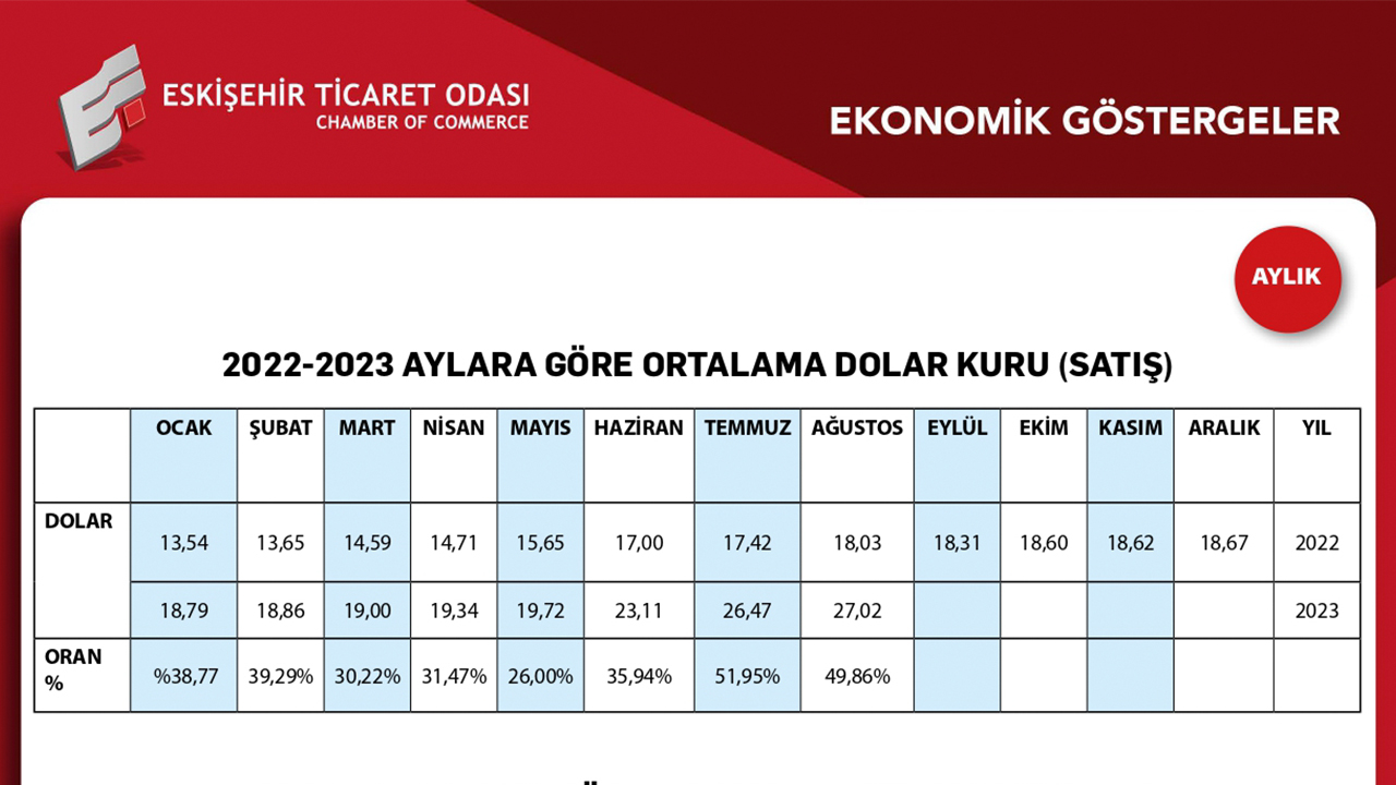ETO tarafından üyelerin Eskişehir ekonomisindeki gelişmeleri yakından takip edebilmeleri için detaylı ekonomik göstergelerle hazırlanan rapor Ağustos ayı itibariyle yayınlanmaya başladı. Eskişehir Ticaret Odası, üyelerine ekonomideki gelişmeleri yakından takip edebilmeleri için aylık olarak detaylı bir rapor hazırlamaya başladı. Ağustos 2023 Eskişehir Ekonomik Göstergeler raporu, ETO üyelerine ulaştırıldı. Raporda döviz kurları ve altın fiyatları, ihracatın ithalatı karşılama oranı, sektörlerin ihracat performansı, aylar bazında toplam ihracat performansı, konut satışı sayıları, açılan ve kapanan işletme sayısı gibi verilere yer verildi. Üyeler ekonomi verilerine kolaylıkla ulaşabilecek Yine raporda 4A kapsamında zorunlu sigortalı sayısı, ödenen çekler, karşılıksız işlem yapılan çeklerin dağılımı, protesto edilen senetlerin dağılımı, merkezi yönetim bütçe gelir ve giderleri, işsizlik oranları ve çalışan istatistikleri, TÜFE oranları gibi ekonomik göstergeler paylaşıldı. Eskişehir Ekonomik Göstergeler raporunu aylık olarak üyelerle paylaşacaklarını belirten Eskişehir Ticaret Odası Başkanı Metin Güler, böylece üyelerin şehir ekonomisine dair verilere kolaylıkla ulaşabileceğini ve gelişmeleri takip edebileceğini söyledi. Üyelere mail yoluyla ulaştırılan Eskişehir Ekonomik Göstergeler raporu etonet.org.tr adresinden https://www.etonet.org.tr/bolgesel-ve-sektorel-analizler-ekonomik-gostergeler.php adresinden PDF formatında indirebilecek.