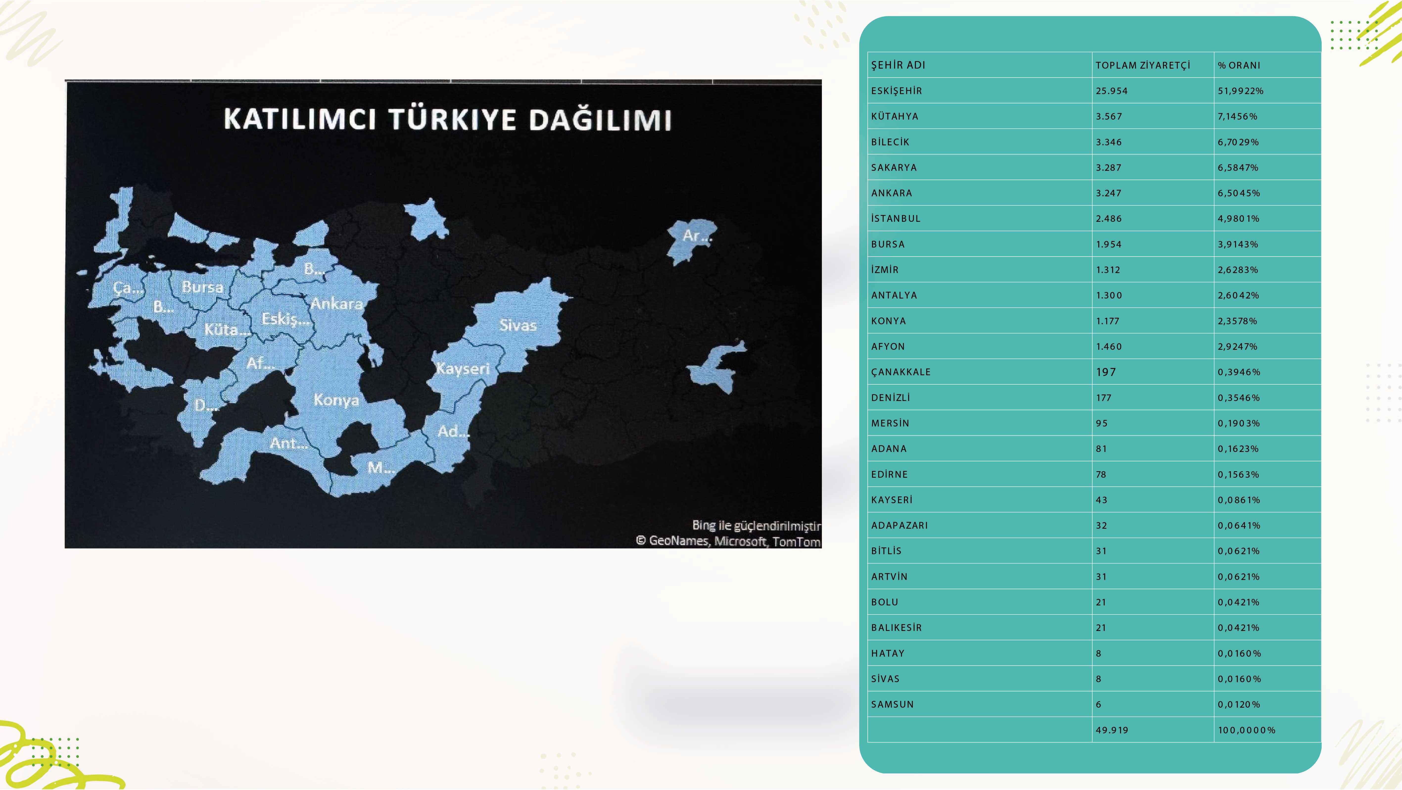 ETO Başkanı Metin Güler, Eskişehir 1. Kamp, Karavan, Tiny House ve Doğa Sporları Fuarı’na şehir dışından gelen 23.965 ziyaretçinin yaptıkları konaklama, alışveriş ve aldıkları hizmetle şehir ekonomisine muazzam bir katkı sağladığını kaydetti. Eskişehir Ticaret Odası Başkanı Metin Güler, Eskişehir 1. Kamp, Karavan, Tiny House ve Doğa Sporları Fuarı’nın ziyaretçi rakamları hakkında değerlendirmede bulundu. Anadolu Ekspo Fuarcılık tarafından, Eskişehir Fuar Kongre Merkezi’nde ilk kez düzenlenen fuarın ilgiyle karşılanmasından memnuniyet duyduklarını belirten Güler, Eskişehir’e bir fuar organizasyonu daha kazandırmanın gururunu yaşadıklarını söyledi. Türkiye’nin dört bir yanındaki şehirlerden Eskişehir’e geldiler Fuarı 49.919 kişinin ziyaret ettiğini belirten ETO Başkanı Metin Güler, fuara gelen ziyaretçilerin 23.965’inin başka illerden olduğunu söyledi. Eskişehir 1. Kamp, Karavan, Tiny House ve Doğa Sporları Fuarı’na 25 farklı şehirden ziyaretçilerin konuk olduğunu belirten Güler, ilk kez düzenlenmesine rağmen fuarın çevre illerin yanı sıra Türkiye’nin dört bir yanından ziyaretçileri konuk ettiğini kaydetti. Fuar şehir ekonomisine ciddi katkı sağladı Fuara Kütahya’dan 3.567, Bilecik’ten 3.346, Sakarya’dan 3.287, Ankara’dan 3.247, İstanbul’dan 2.486, Bursa’dan 1.954, İzmir’den 1.312, Antalya’dan 1.300, Konya’dan 1.177, Afyonkarahisar’dan 1.460 kişinin ziyaretçi olarak geldiğini belirten Güler, katılımcı firmaların ve çalışanlarının bu rakamlara dahil olmadığını kaydetti. Fuar dolayısıyla Türkiye’nin dört bir yanından gelenlerin Eskişehir’de yaptıkları konaklama, alışveriş ve aldıkları hizmetle şehir ekonomisine ciddi bir katkı sağladığını belirten ETO Başkanı Metin Güler, Eskişehir Fuar Kongre Merkezi’nin yeni organizasyonlarla şehrin ekonomisine değer katmaya devam edeceğinin altını çizdi. Güler fuarın düzenlenmesine katkı sağlayan kuruluşlara da teşekkür etti.
