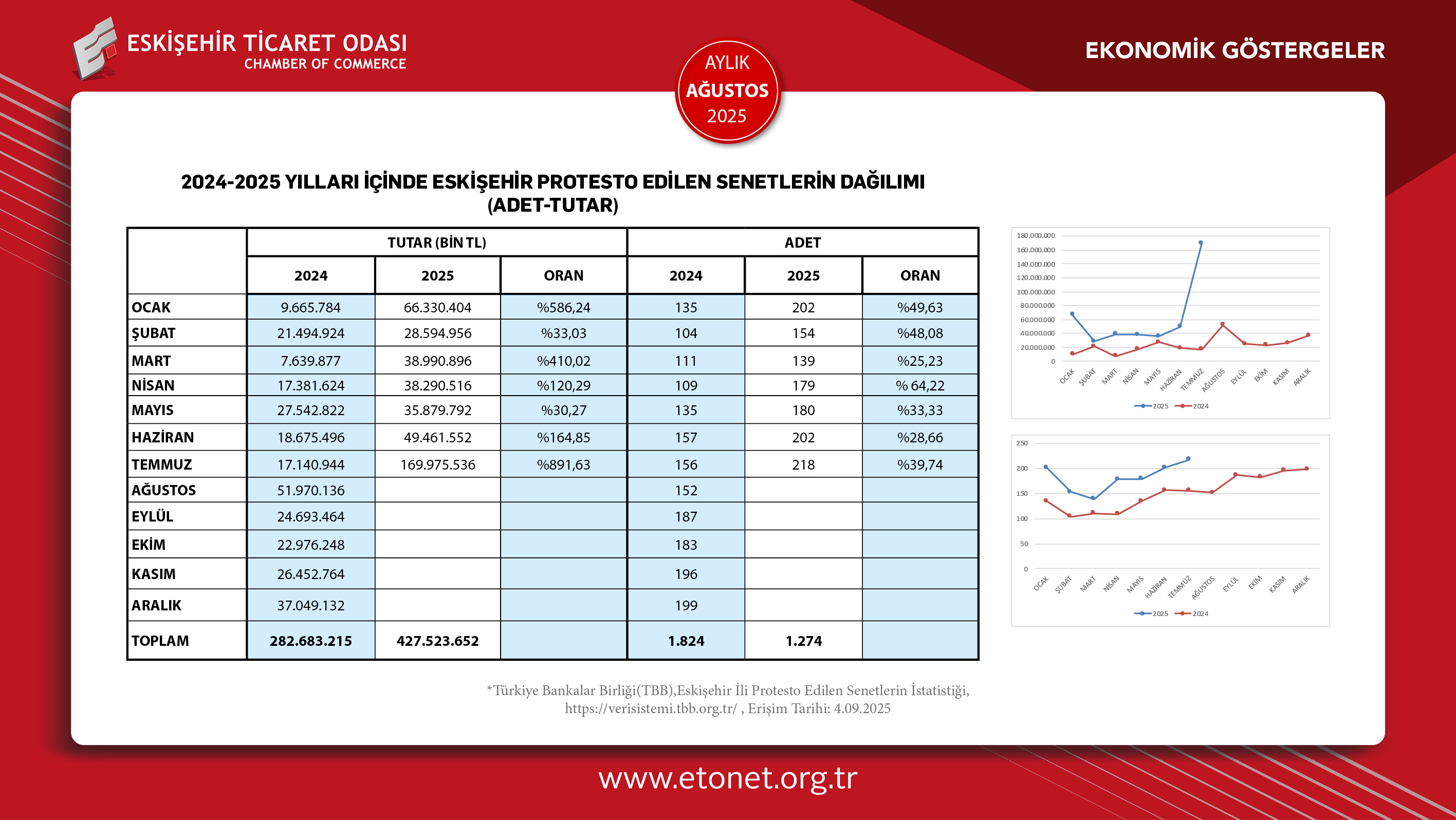 Raporda, Eskişehir’de Temmuz 2024’te 17 milyon 140 bin 944 TL olan protesto edilen senet tutarının, 2025 yılının aynı ayında, %891,63 artışla 169 milyon 975 bin 536 TL’ye yükseldiği dikkat çekti. Eskişehir Ekonomik Göstergeler Raporu’nun Ağustos 2025 sayısına ve daha önce yayınlanan raporlara www.etonet.org.tr adresindeki “Hizmetlerimiz” sekmesinden PDF formatında erişilebiliyor.