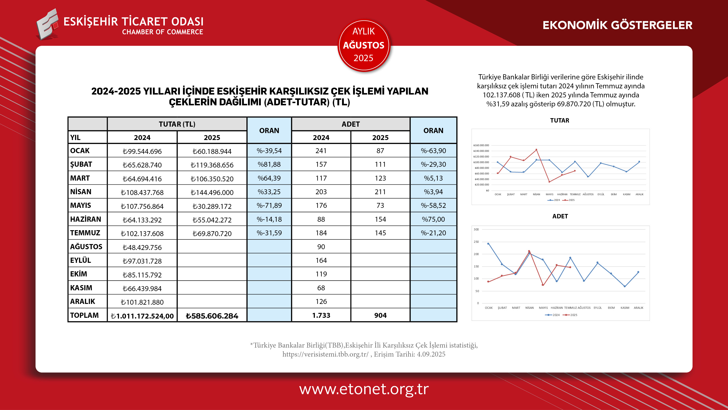 Raporda, TÜİK verilerine göre Eskişehir’de konut satış sayısı 2024 yılının Temmuz ayında 1.881 iken, 2025 yılının Temmuz ayında konut satış sayısının %26,10 artarak, 2.372’ye çıktığı gözlemlendi. Raporda, Türkiye Bankalar Birliği verilerine göre Eskişehir’de 2024 yılının Temmuz ayında 102 milyon 137 bin 608 TL olan karşılıksız çek işlemi tutarının 2025 yılının aynı ayında %31,59 oranında azalarak 69 milyon 870 bin 720 TL’ye gerilediği görüldü.